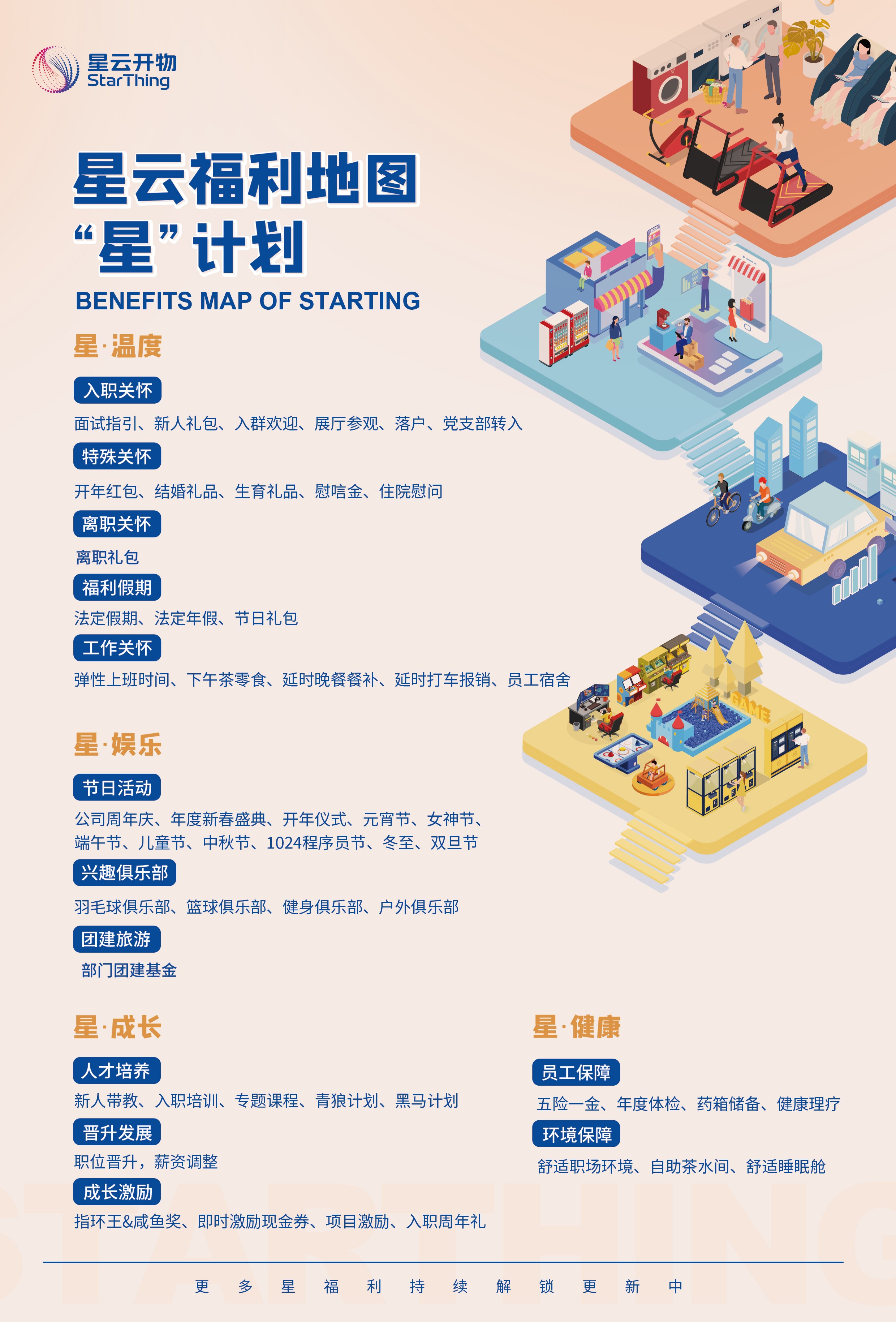 多年来,星云开物重视员工福利体系的建设,逐步构建起集工作关怀、娱乐休闲、个人成长及健康保障于一体的“星”计划,包括星温度、星娱乐、星健康、星成长四大板块,为员工提供多元化、全方位的福利体系。