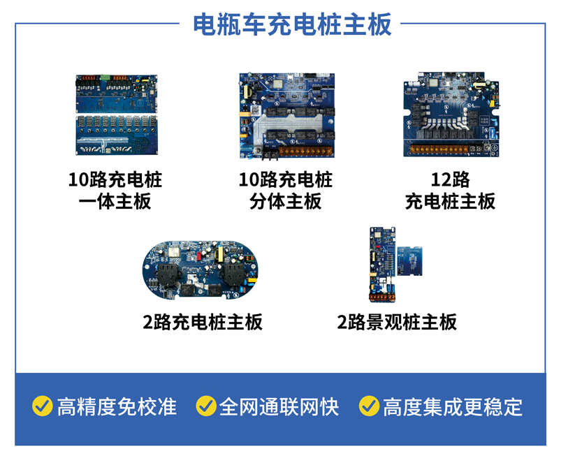 两轮电瓶车充电方案则主打高精度免校准主板,使用集成模组提升稳定性,配套设备管理、经销商代理、小程序等平台,支持灵活计费与品牌自定义,适用于各类社区与公共场所。